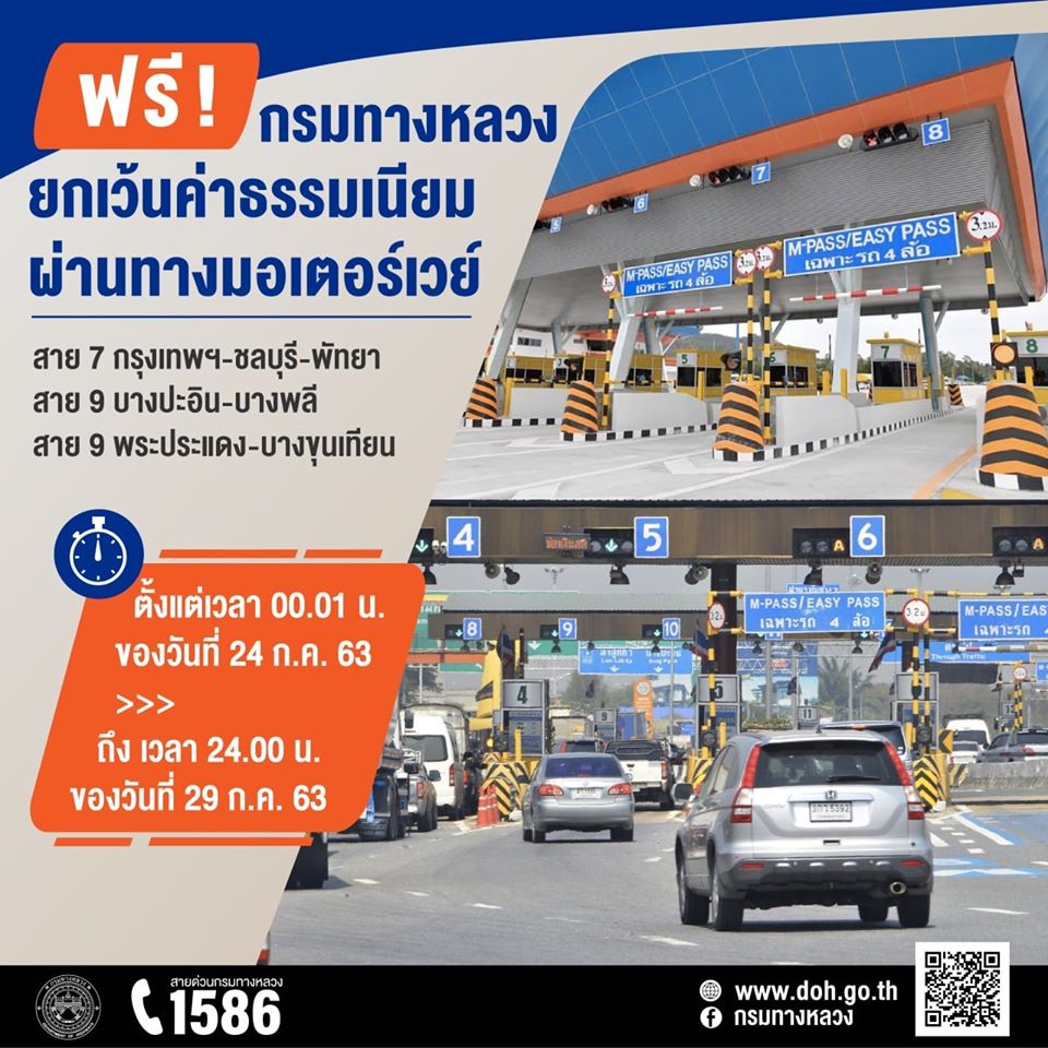 วันที่ 24 - 29 ก.ค. 2563 ยกเว้นค่าผ่านทางฟรี สำหรับมอเตอร์เวย์ สาย 7, 9 |