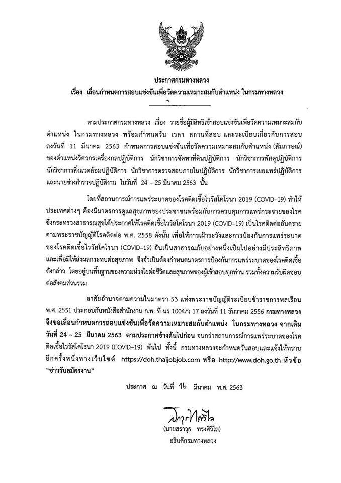 เลื่อนกำหนดการสอบแข่งขันเพื่อวัดความเหมาะสมกับตำแหน่ง ในกรมทางหลวง