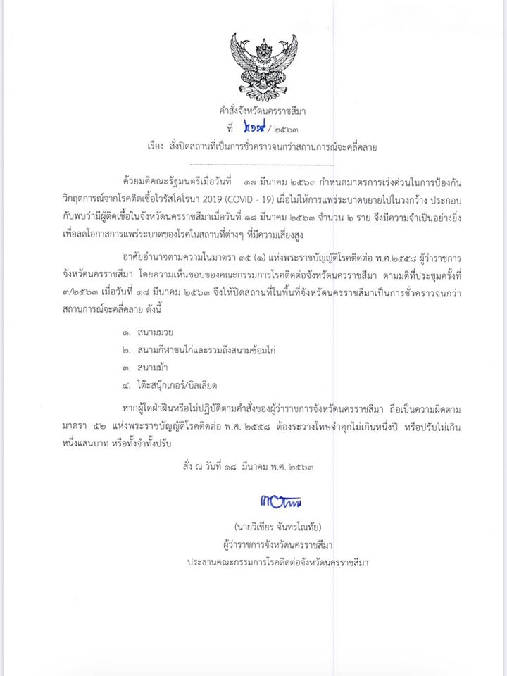 ประกาศคำสั่งปิดสถานที่เมืองโคราช
