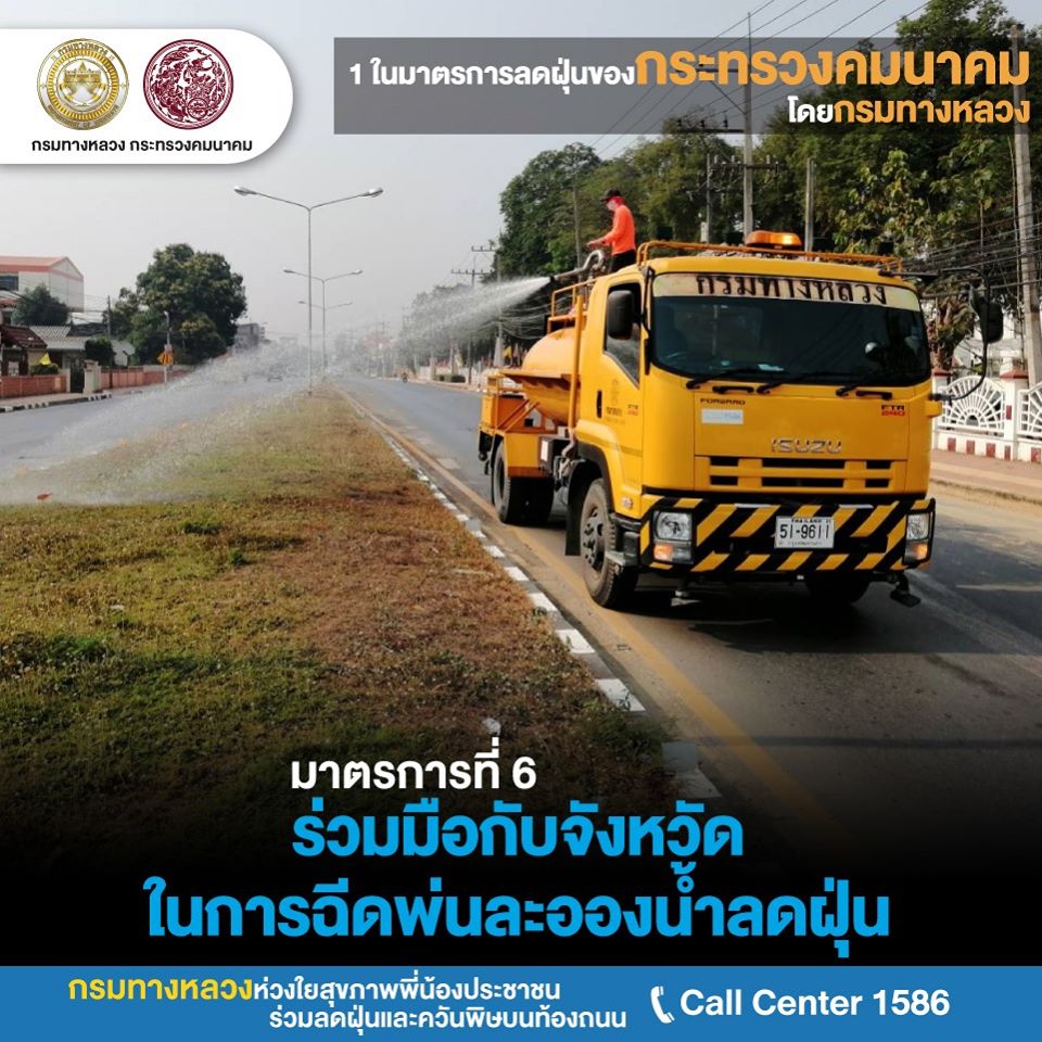 ปฏิบัติการที่ 6 กรมทางหลวงร่วมลดฝุ่น PM 2.5 ประสานความร่วมมือกับจังหวัดในการฉีดพ่นละอองน้ำ ลดฝุ่น