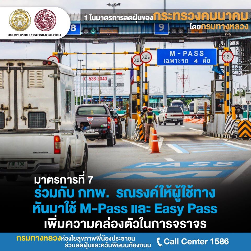 ปฏิบัติการที่ 7 กรมทางหลวงร่วมลดฝุ่น PM 2.5 ร่วมกับการทางพิเศษแห่งประเทศไทยรณรงค์ให้ผู้ใช้ทาง หันมาใช้ M-Pass และ Easy Pass เพิ่มความคล่องตัว ในการจราจร