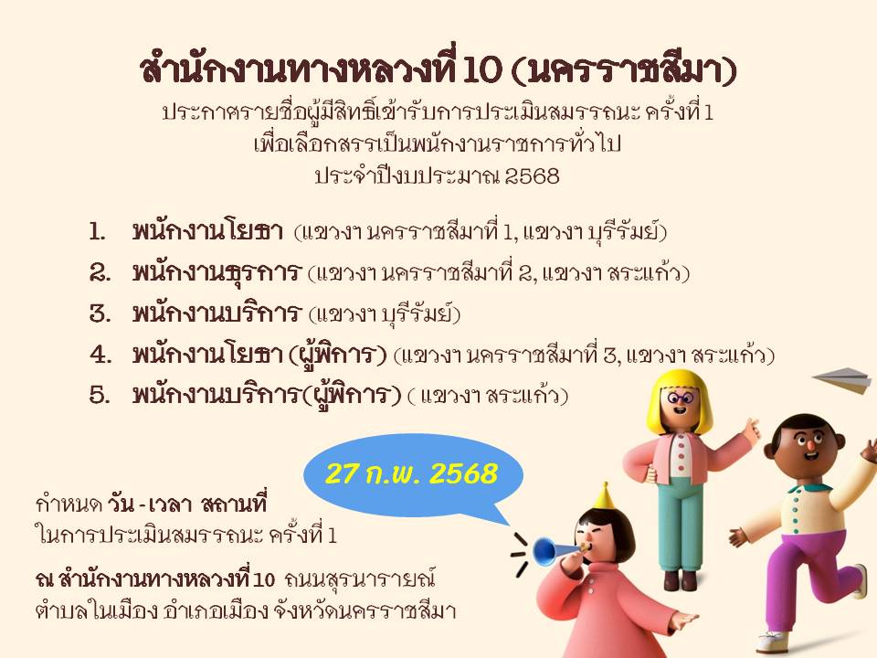 สำนักงานทางหลวงที่ 10 (นครราชสีมา) ประกาศรายชื่อผู้มีสิทธิเข้ารับการประเมินความรู้ ความสามารถ ทักษะ สมรรถนะครั้งที่ 1 พร้อมกำหนด วันเวลา สถานที่ประเมิน และระเบียบปฏิบัติเกี่ยวกับการประเมิน ในตำแหน่ง