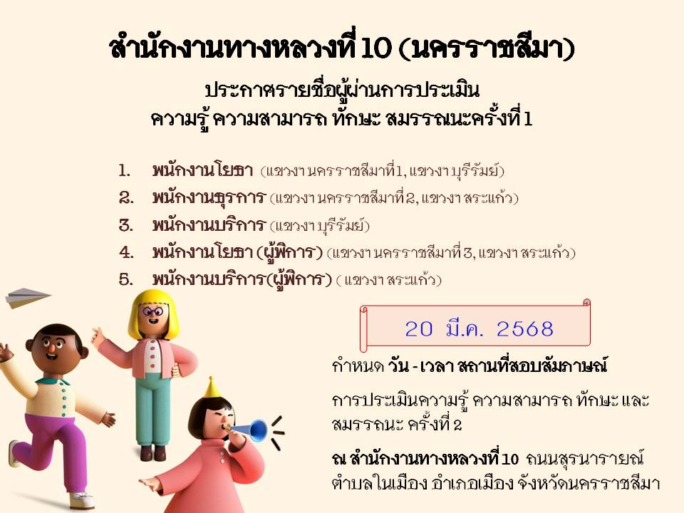 สำนักงานทางหลวงที่ 10 (นครราชสีมา) ประกาศรายชื่อผู้ผ่านการประเมินความรู้ ความสามารถ ทักษะ สมรรถนะครั้งที่ 1 และมีสิทธิ์เข้ารับการประเมินความรู้ ความสามารถ ทักษะ และสมรรถนะ ครั้งที่ 2 ในตำแหน่ง