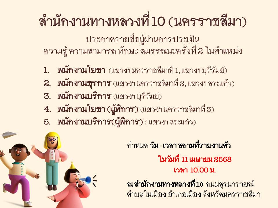 สำนักงานทางหลวงที่ 10 (นครราชสีมา) ประกาศรายชื่อผู้ผ่านการเลือกสรรเพื่อจัดจ้างเป็นพนักงานราชการ ในตำแหน่ง