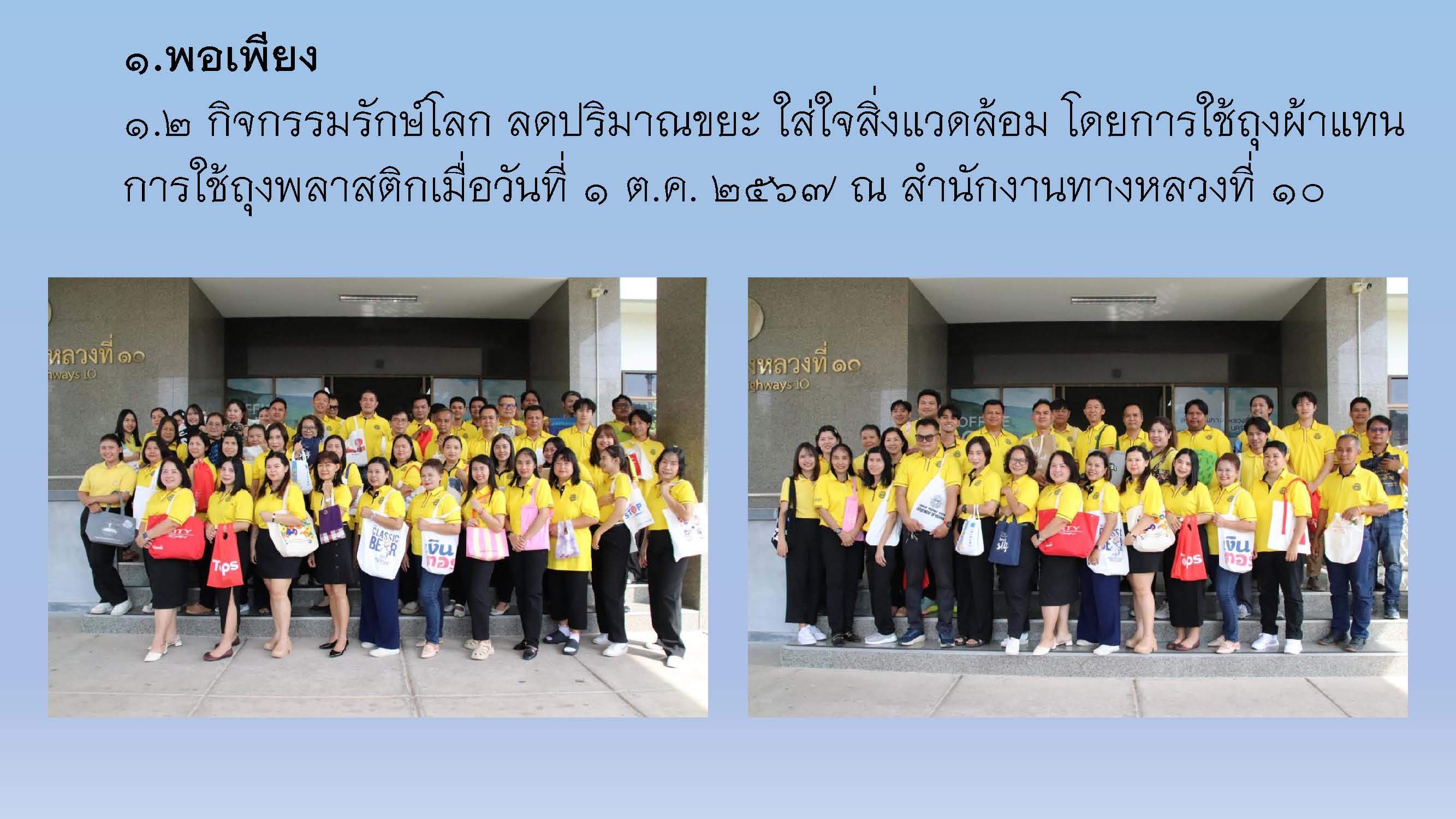 1.2 กิจกรรมรักษ์โลก ลดปริมาณขยะ ใส่ใจสิ่งแวดล้อม โดยการใช้ถุงผ้าแทนการใช้ถุงพลาสติกเมื่อวันที่ 1 ต.ค. 2567 ณ สำนักงานทางหลวงที่ 10
