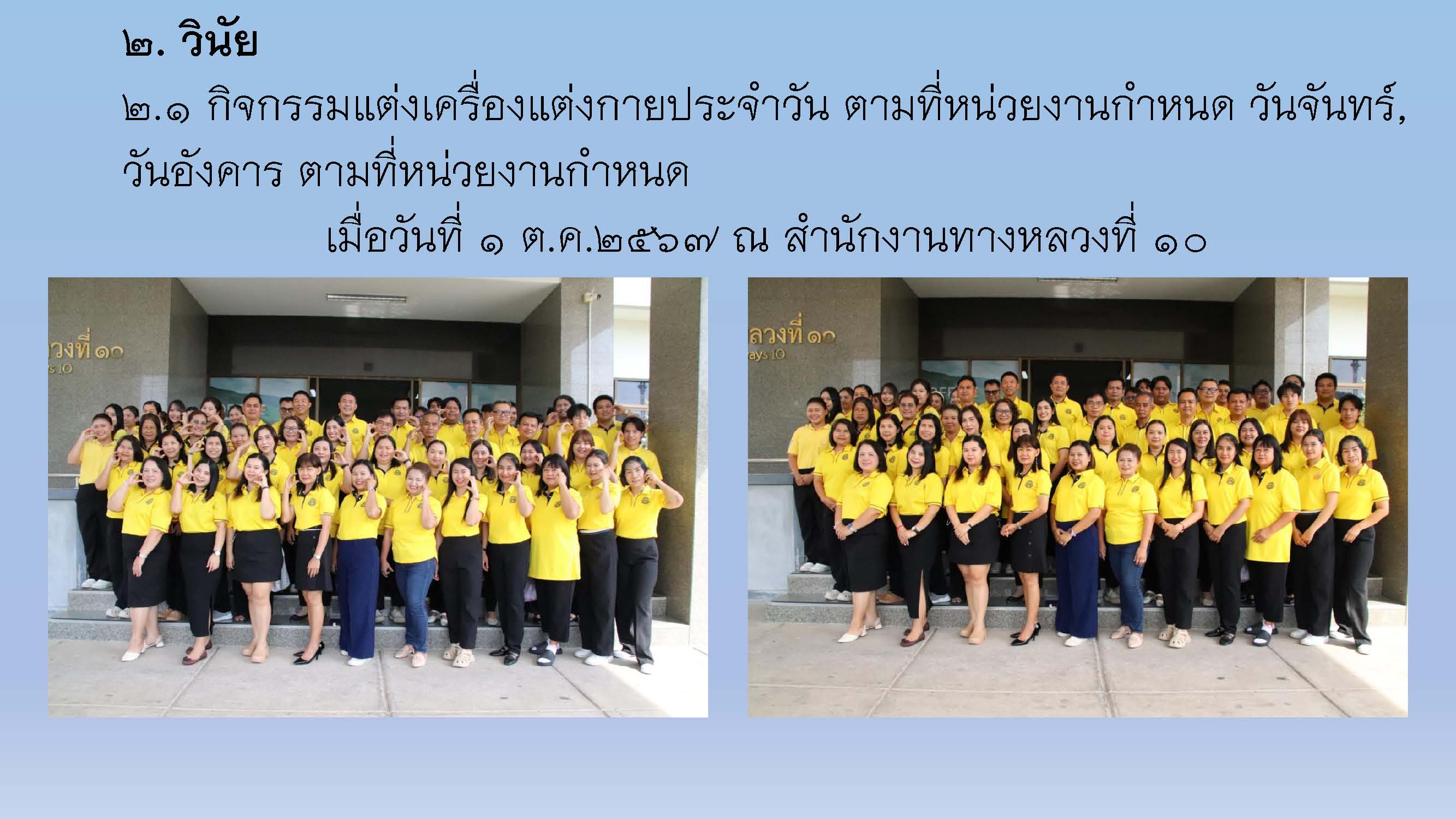 2.1 กิจกรรมแต่งเครื่องแต่งกายประจำวัน ตามที่หน่วยงานกำหนด วันจันทร์, วันอังคาร ตามที่หน่วยงานกำหนด เมื่อวันที่ 1 ต.ค.2567 ณ สำนักงานทางหลวงที่ 10