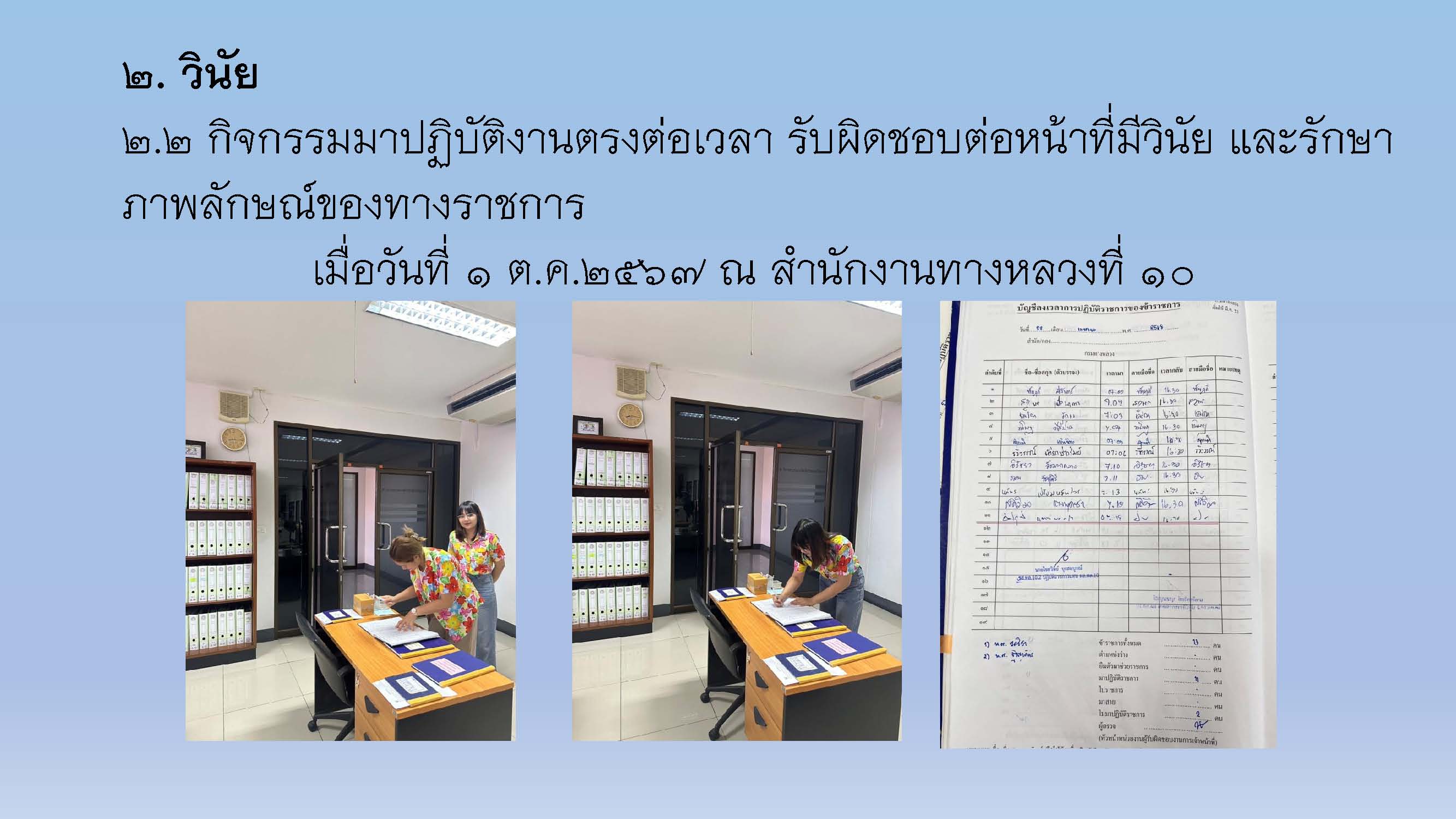 2.2 กิจกรรมมาปฏิบัติงานตรงต่อเวลา รับผิดชอบต่อหน้าที่มีวินัย และรักษาภาพลักษณ์ของทางราชการ เมื่อวันที่ 1 ต.ค.2567 ณ สำนักงานทางหลวงที่ 10