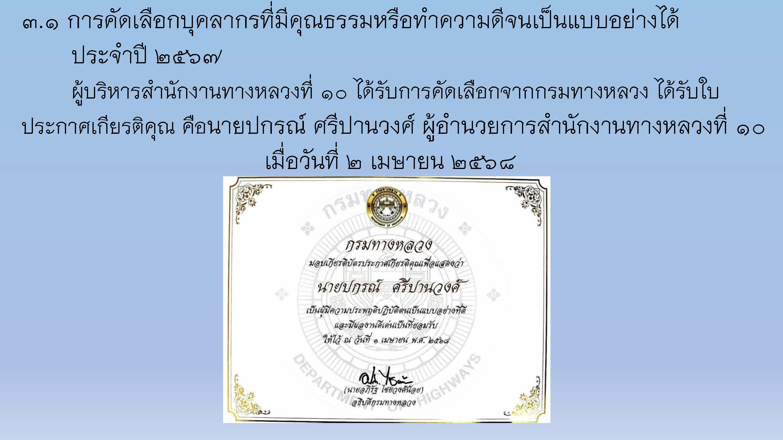 3.2 การคัดเลือกบุคลากรที่มีคุณธรรมหรือทำความดีจนเป็นแบบอย่างได้ ประจำปี 2567 โดย ผู้บริหารสำนักงานทางหลวงที่ 10 ได้รับการคัดเลือกจากกรมทางหลวง ได้รับใบประกาศเกียรติคุณ คือนายปกรณ์ ศรีปานวงศ์ ผู้อำนวยการสำนักงานทางหลวงที่ 10 เมื่อวันที่ 2 เมษายน 2568