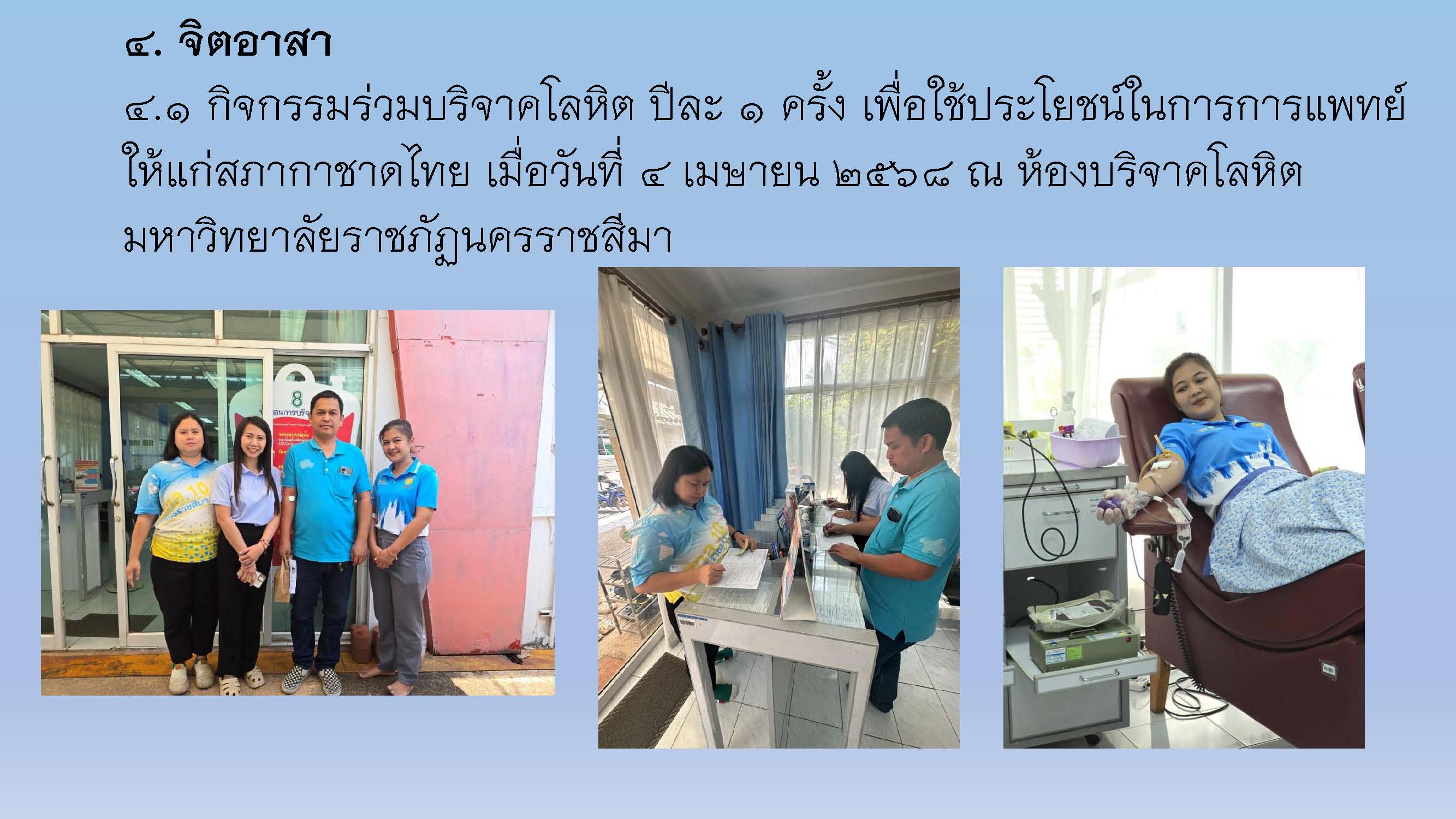 4.1 กิจกรรมร่วมบริจาคโลหิต ปีละ 1 ครั้ง เพื่อใช้ประโยชน์ในการการแพทย์ ให้แก่สภากาชาดไทย เมื่อวันที่ 4 เมษายน 2568 ณ ห้องบริจาคโลหิต มหาวิทยาลัยราชภัฏนครราชสีมา