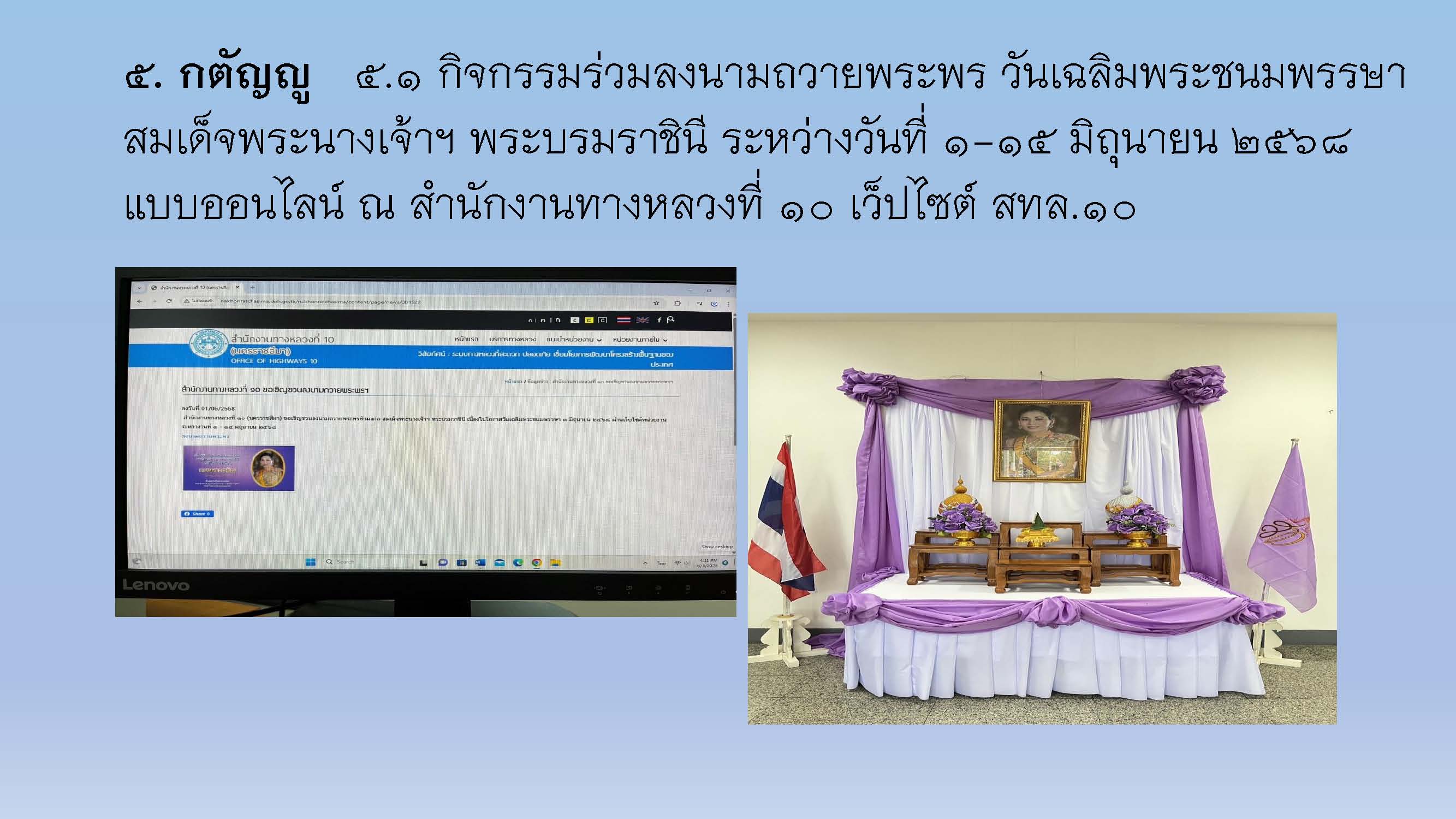 5.1 กิจกรรมร่วมลงนามถวายพระพร วันเฉลิมพระชนมพรรษาสมเด็จพระนางเจ้าฯ พระบรมราชินี ระหว่างวันที่ 1-15 มิถุนายน 2568 แบบออนไลน์ ณ สำนักงานทางหลวงที่ 10 เว็ปไซต์ สทล.10