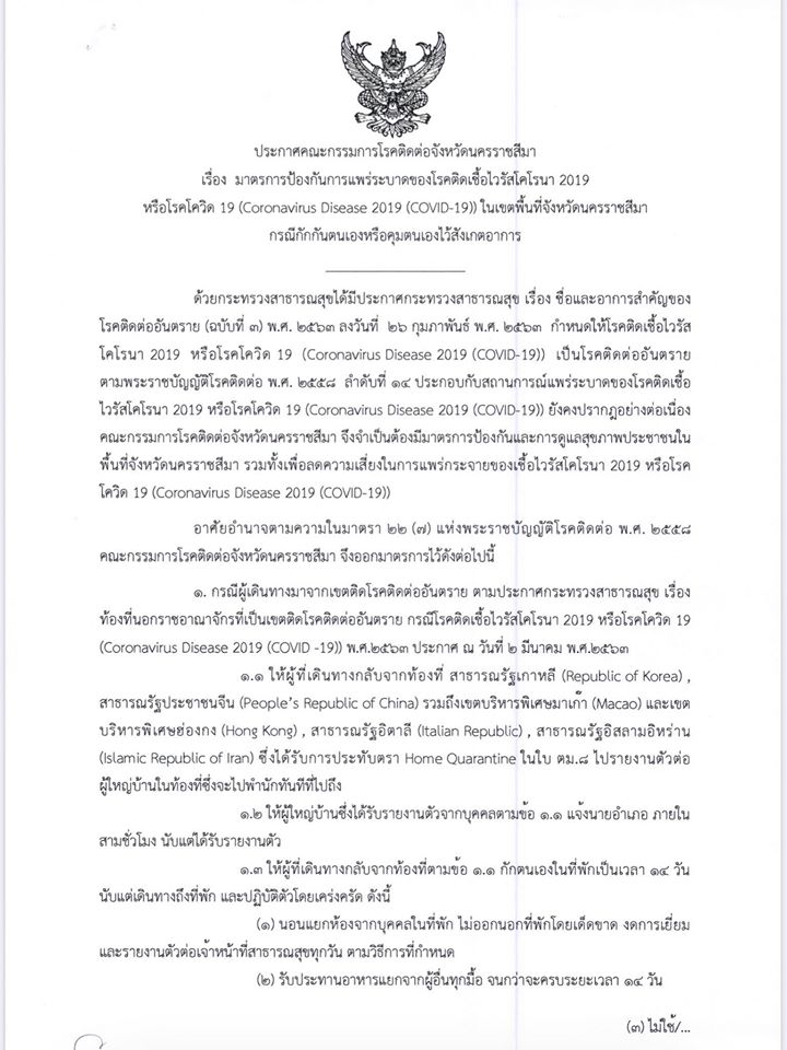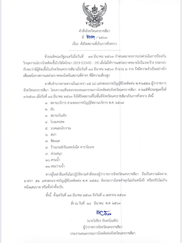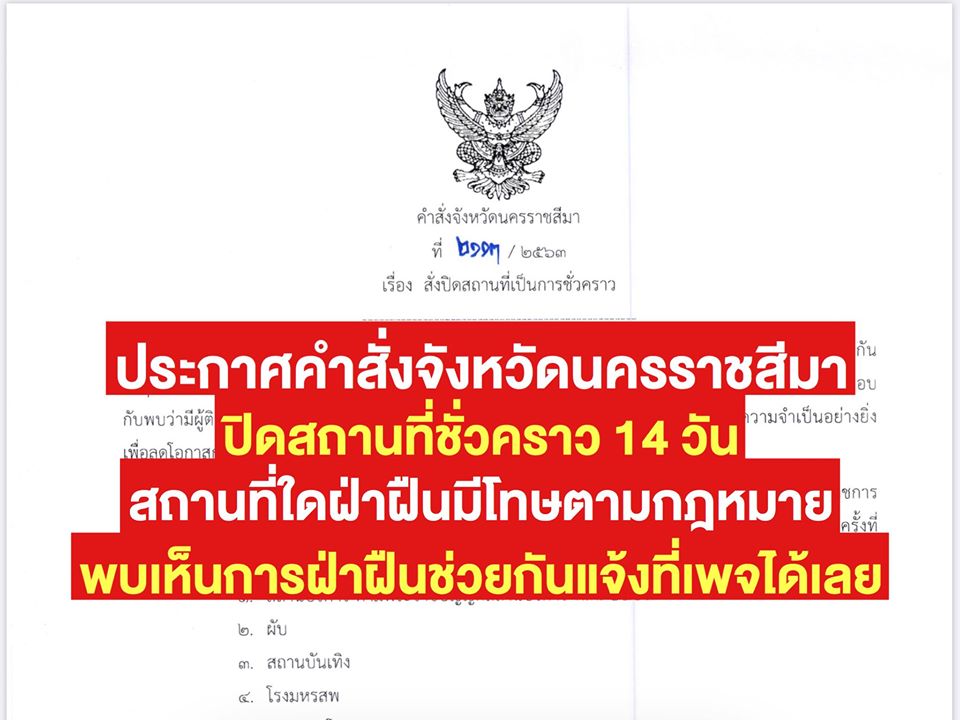 รวมหนังสือประกาศคำสั่งจังหวัดนครราชสีมา ในการปิดสถานที่ชั่วคราวเป็นระยะเวลา 14 วัน และมาตรการรับมือไวรัส COVID-19 ในพื้นที่จังหวัดนครราชสีมา หากพบการฝ่าฝืนแจ้งเจ้าหน้าที่ตำรวจในพื้นที่หรือแจ้งที่เพจได้เลย ประกาศนี้ครอบคลุมจังหวัดนครราชสีมาทั้ง 32 อำเภอ