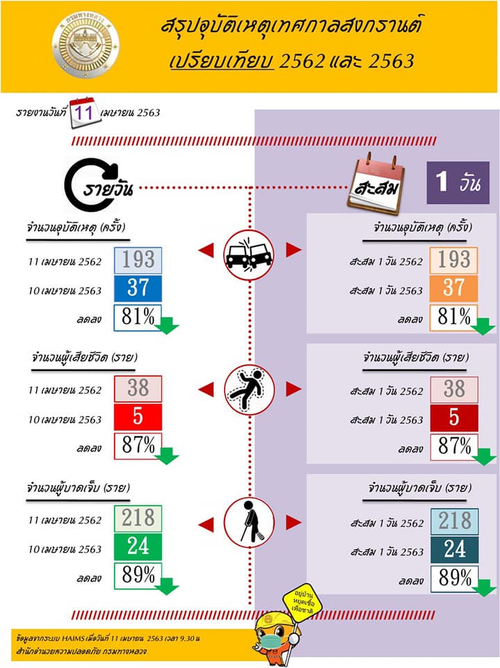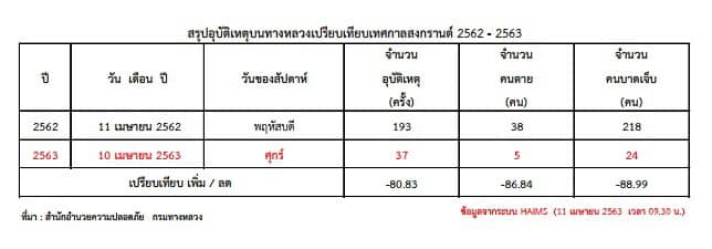 สำหรับสถิตการเกิดอุบัติเหตุพบว่าในวันที่ 10 เม.ย. 2563 เกิดอุบัติเหตุรวม 37 ครั้ง ลดลง 81% เมื่อเทียบกับวันที่ 11 เม.ย. 62 มีผู้เสียชีวิต 5 ราย ลดลง 87% และบาดเจ็บ 24 ราย ลดลง 89%