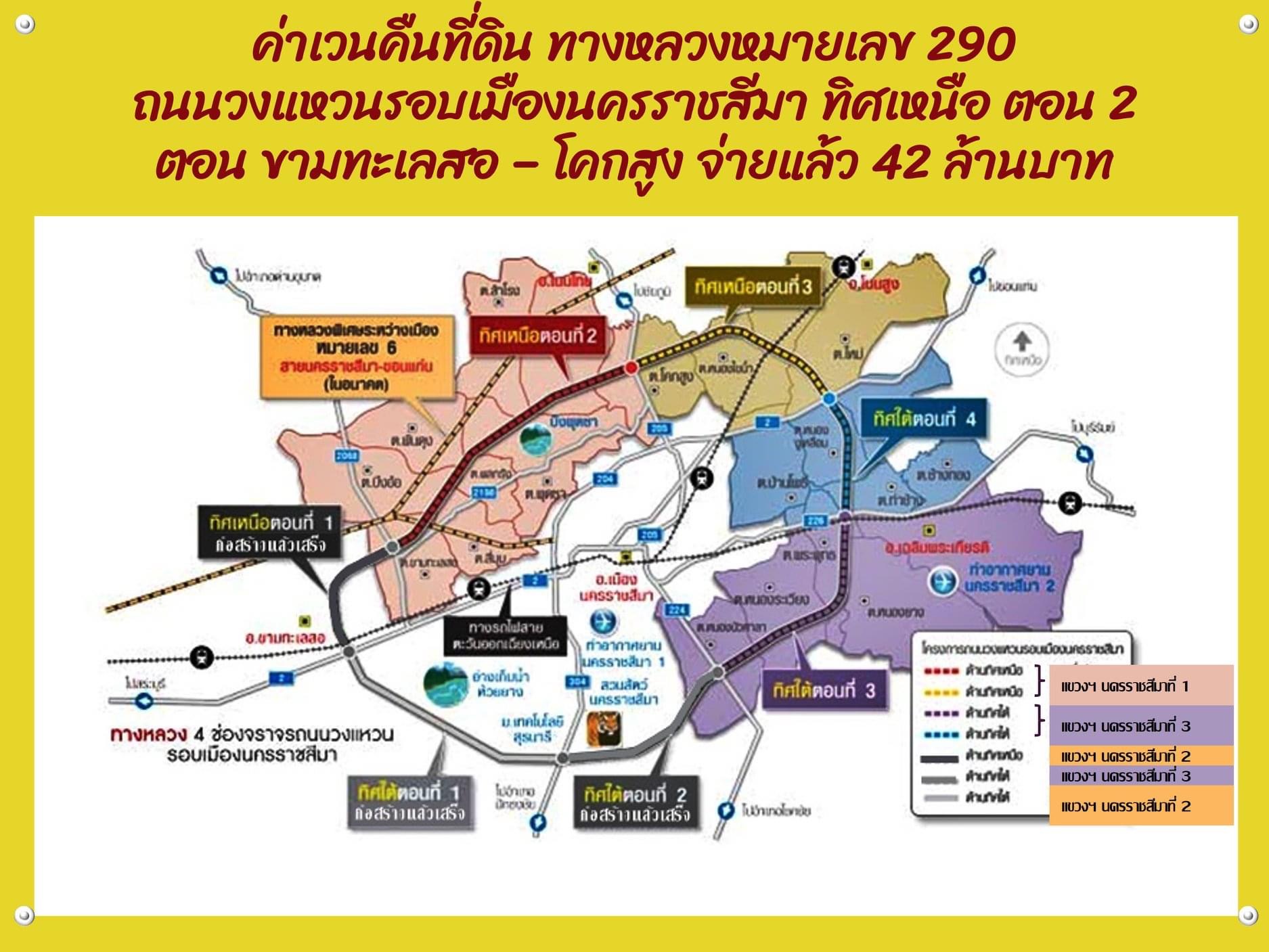 สำนักงานทางหลวงที่ 10 (นครราชสีมา) จ่ายค่าเวนคืนที่ดิน โครงการก่อสร้างทางหลวงหมายเลข 290 สายถนนวงแหวนรอบเมืองนครราชสีมา ด้านเหนือ ตอน 2 แล้ว 42 ล้านบาท เร่งขออนุมัติจ่ายอีก 200 กว่าราย