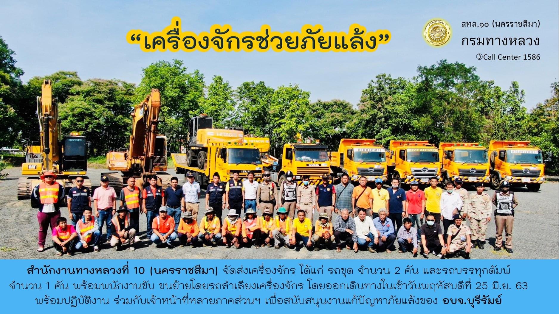 สำนักงานทางหลวงที่ 10 (นครราชสีมา) จัดส่งเครื่องจักร ได้แก่ รถขุด จำนวน 2 คัน และรถบรรทุกดัมพ์ จำนวน 1 คัน พร้อมพนักงานขับ ขนย้ายโดยรถลำเลียงเครื่องจักร โดยออกเดินทางในวันพฤหัสบดีที่ 25 มิ.ย. 63 พร้อมปฏิบัติงาน เพื่อสนับสนุนงานแก้ปัญหาภัยแล้งของ อบจ.บุรีรัมย์