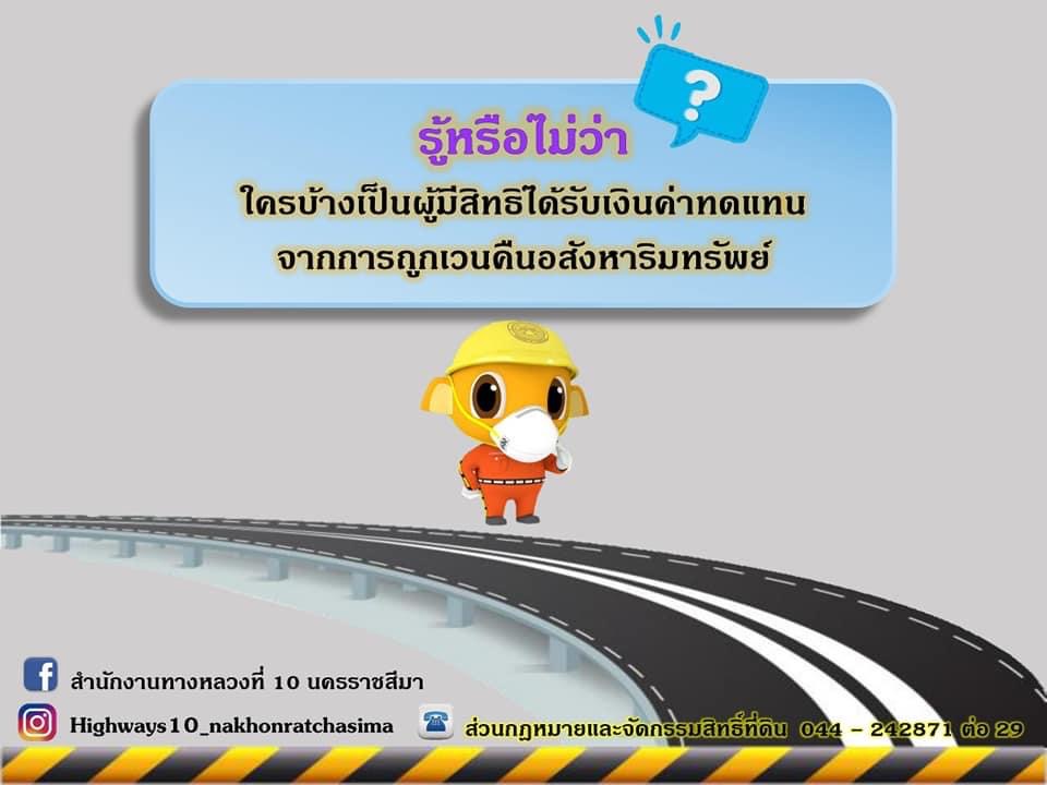 สอบถามข้อมูลเพิ่มเติมได้ที่ ส่วนกฏหมายและจัดกรรมสิทธิ์ที่ดิน สำนักงานทางหลวงที่ 10 (นครราชสีมา) 044-242871 ต่อ 29