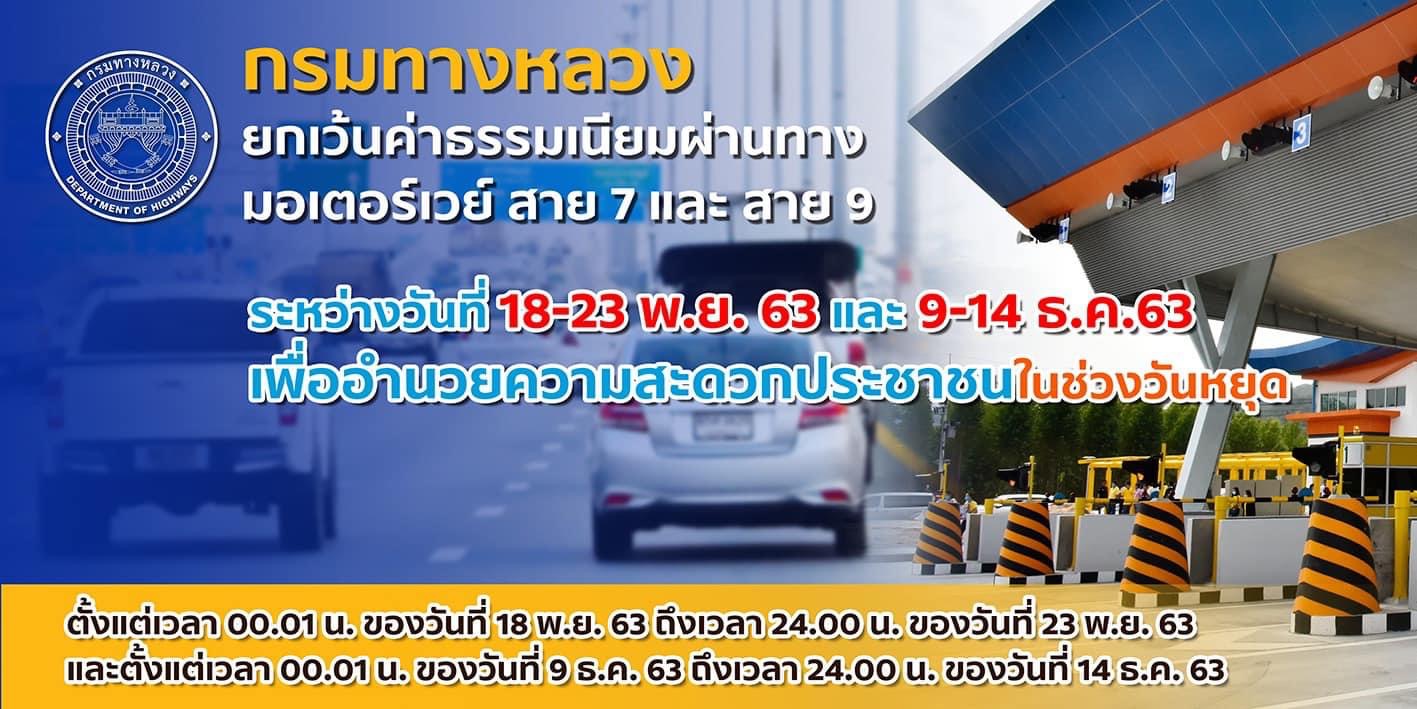 นายสราวุธ ทรงศิวิไล อธิบดีกรมทางหลวง เปิดเผยว่า เมื่อวันที่ 10 พ.ย. 63 ที่ประชุม ครม. ได้มีมติเห็นชอบยกเว้นค่าธรรมเนียมผ่านทางบนทางหลวงพิเศษระหว่างเมืองของกรมทางหลวง ในช่วงวันหยุดราชการต่อเนื่องรวม 12 วัน ได้แก่ ทางหลวงพิเศษหมายเลข 7 กรุงเทพ – ชลบุรี – พัทยา และ ทางหลวงพิเศษหมายเลข 9 บางปะอิน – บางพลี และพระประแดง – ต่างระดับบางขุนเทียน ตั้งแต่เวลา 00.01 น. ของวันที่ 18 พ.ย. 63 ถึง เวลา 24.00 น. ของวันที่ 23 พ.ย. 63 และ ตั้งแต่เวลา 00.01 น. ของวันที่ 9 ธ.ค. 63 ถึง เวลา 24.00 น. ของวันที่ 14 ธ.ค. 63