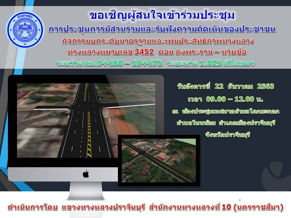 แขวงทางหลวงปราจีนบุรี ขอเชิญผู้สนใจเข้าร่วมประชุมการมีส่วนร่วมและรับฟังความคิดเห็นของประชาชน กิจกรรมยกระดับมาตรฐานและเพิ่มประสิทธิภาพทางหลวง ทางหลวงหมายเลข 3452 ตอน ดงพระราม - ห้วยขื่อ ระหว่าง กม. 9+650 - 10+675 (งานปรับปรุงขยาย 4 ช่องจราจร บริเวณแยกโคกมะกอก) ในวันอังคารที่ 22 ธันวาคม 2563 เวลา 09.00 - 10.00 น. ณ เทศบาลตำบลโคกมะกอก ต.โนนห้อม อ.เมืองปราจีนบุรี จ.ปราจีนบุรี
