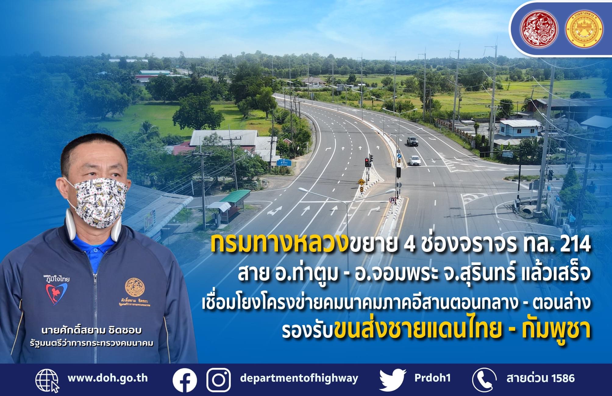 กรมทางหลวง ขยาย 4 ช่องจราจร ทางหลวงหมายเลข 214 ตอน อ.ท่าตูม - อ.จอมพระ จ.สุรินทร์ แล้วเสร็จ เชื่อมโยงโครงข่ายคมนาคมภาคอีสานตอนกลาง-ตอนล่าง รองรับขนส่งชายแดนไทย-กัมพูชา