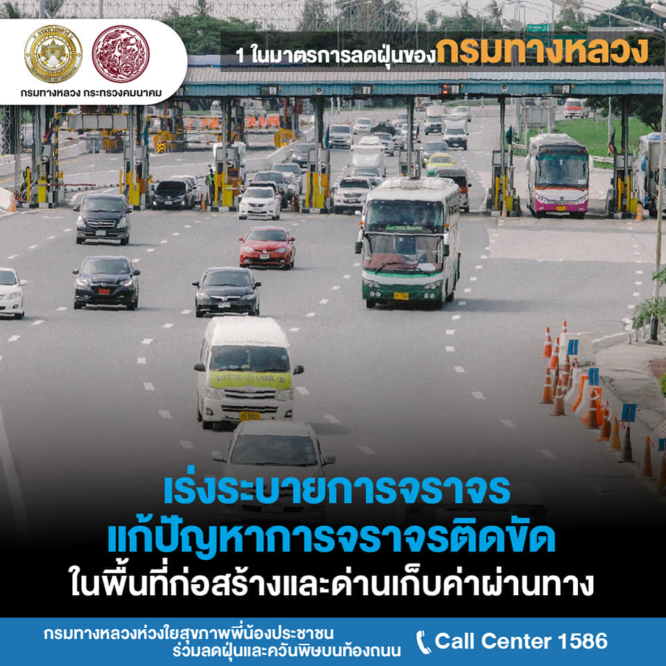 กรมทางหลวงเดินหน้าแก้ไขปัญหามลพิษ PM 2.5 ขานรับวาระแห่งชาติ กรมทางหลวงสั่งหน่วยงานในสังกัดเร่งแก้ไขปัญหา PM 2.5 งัดมาตรการเข้มงวดงานก่อสร้าง-บำรุงทางให้ก่อฝุ่นน้อยที่สุด ติดตั้งเครื่องปล่อยละอองน้ำจับฝุ่น 15 แห่ง และจับมือหลายหน่วยงานเข้มใช้รถควันดำ จอดแช่ ลดค่าธรรมเนียมผ่านทาง M-Pass และ Easy Pass จูงใจใช้เพิ่มลดปัญหารถติดหน้าด่านก่อมลพิษ