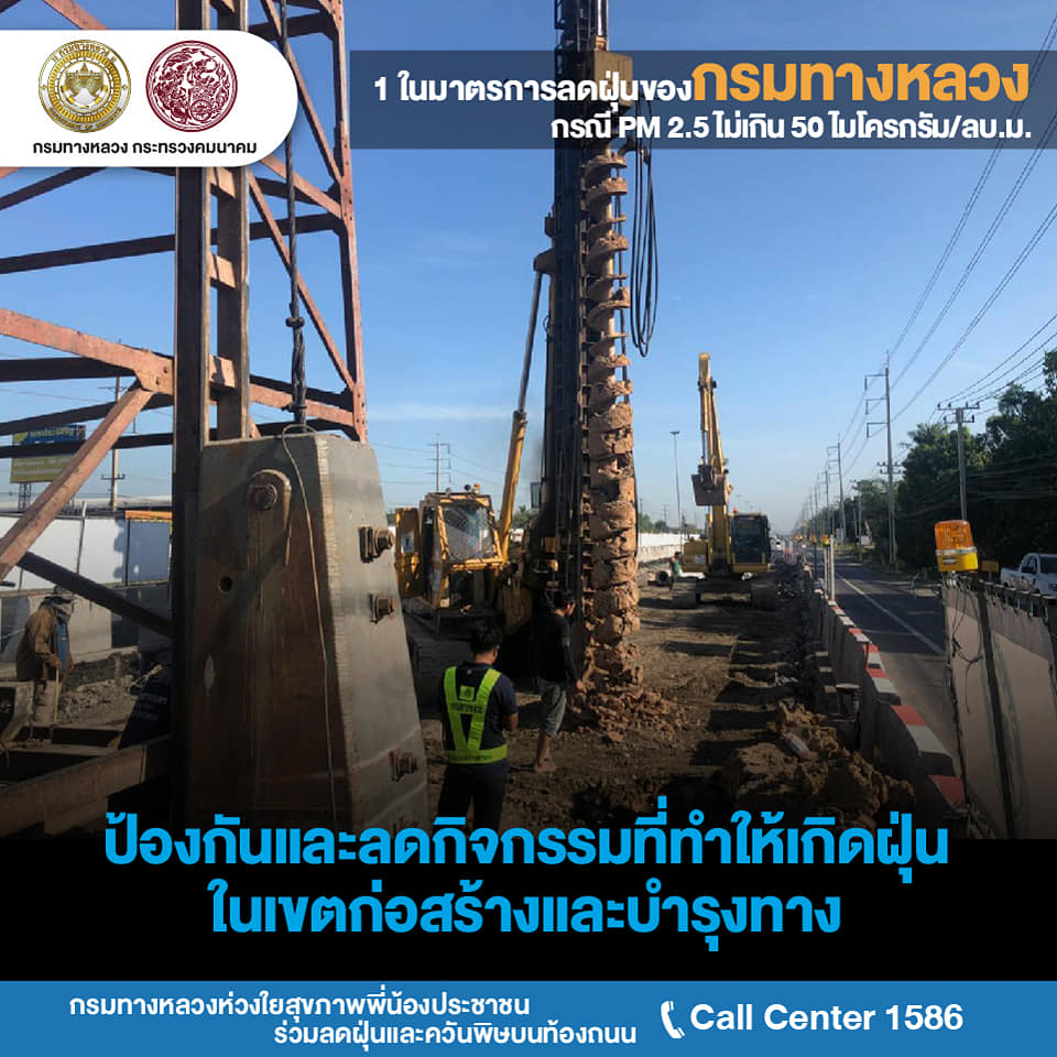 ด้านงานก่อสร้างและบำรุงทาง มีการจำกัดพื้นที่หน้างานที่ก่อให้เกิดฝุ่นละอองให้น้อยที่สุดเท่าที่จำเป็น การเข้มงวดมาตรการป้องกันและลดฝุ่นละออง เช่น การปิดคลุมวัสดุก่อสร้างในการเก็บกองและ