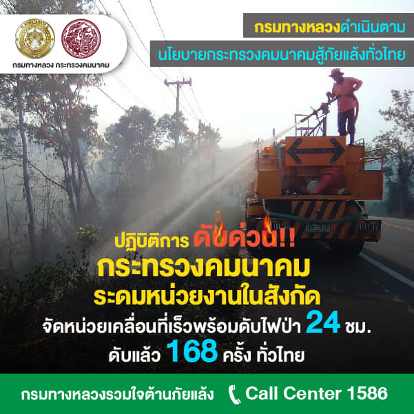 ในช่วงฤดูแล้งของทุกปีมักจะเกิดปัญหาหมอกควัน ปัญหาไฟป่า และไฟไหม้หญ้าสองข้างทางหลวงในหลายพื้นที่ซึ่งทำให้บดบังทัศนวิสัยในการขับขี่และอาจก่อให้เกิดอันตรายต่อผู้ใช้ทางได้กรมทางหลวงจึงจัดหน่วยเคลื่อนที่เร็วพร้อมปฏิบัติการตลอด24 ชั่วโมง คอยเฝ้าระวังเหตุไฟไหม้และดับไฟสองข้างทางหลวงซึ่งขณะนี้ ดับไปแล้ว 168 ครั้ง ทั่วประเทศประชาชนพบเห็นหมอกควัน ไฟป่า ไฟไหม้หญ้าสองข้างทางหลวง สามารถแจ้งได้ทันทีที่สายด่วนกรมทางหลวง 1586ตลอด 24 ชั่วโมง