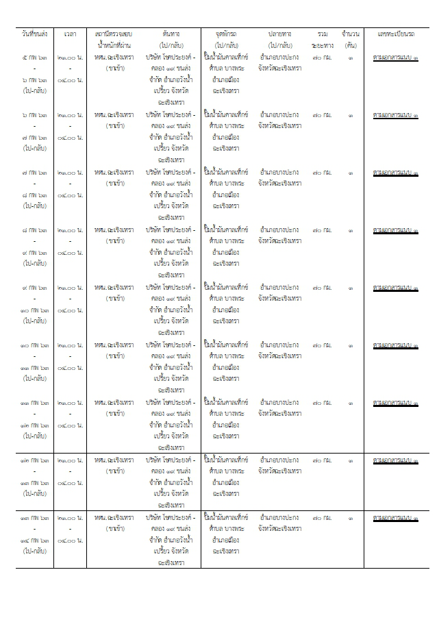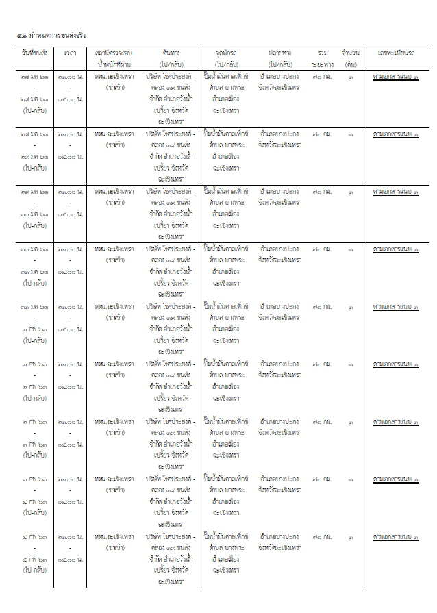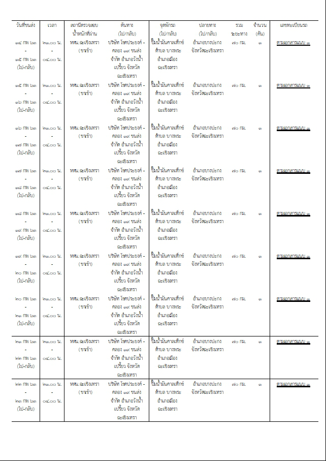 ตั้งแต่เวลา 21.00 - 04.00 น. ในวันที่ 27 มกราคม 2563 - 25 กุมภาพันธ์ 2563 ระยะเวลารวม 30 วัน เนื่องจาก บริษัท โชคประยงค์-คลอง 19 ขนส่ง จำกัด จะดำเนินการขนส่งรถรีไซคลิ่ง รถแบคโฮ และรถแทรกเตอร์ น้ำหนัก 65 ตัน จากบริษัท โชคประยงค์ คลอง 19 - ขนส่ง จำกัด จังหวัดฉะเชิงเทรา ไปยัง อำเภอบางปะกง จังหวัดฉะเชิงเทรา (ไป – กลับ) ตามหนังสืออนุญาต เลขที่ คค 06148/177 ลงวันที่ 9 มกราคม 2563 หมดอายุวันที่ 8 มกราคม 2564 และหนังสือคำขออนุมัติใช้เส้นทาง ตามคำขอเลขที่ 84 ลงวันที่ 24 มกราคม 2563 ในเส้นทางดังกล่าว