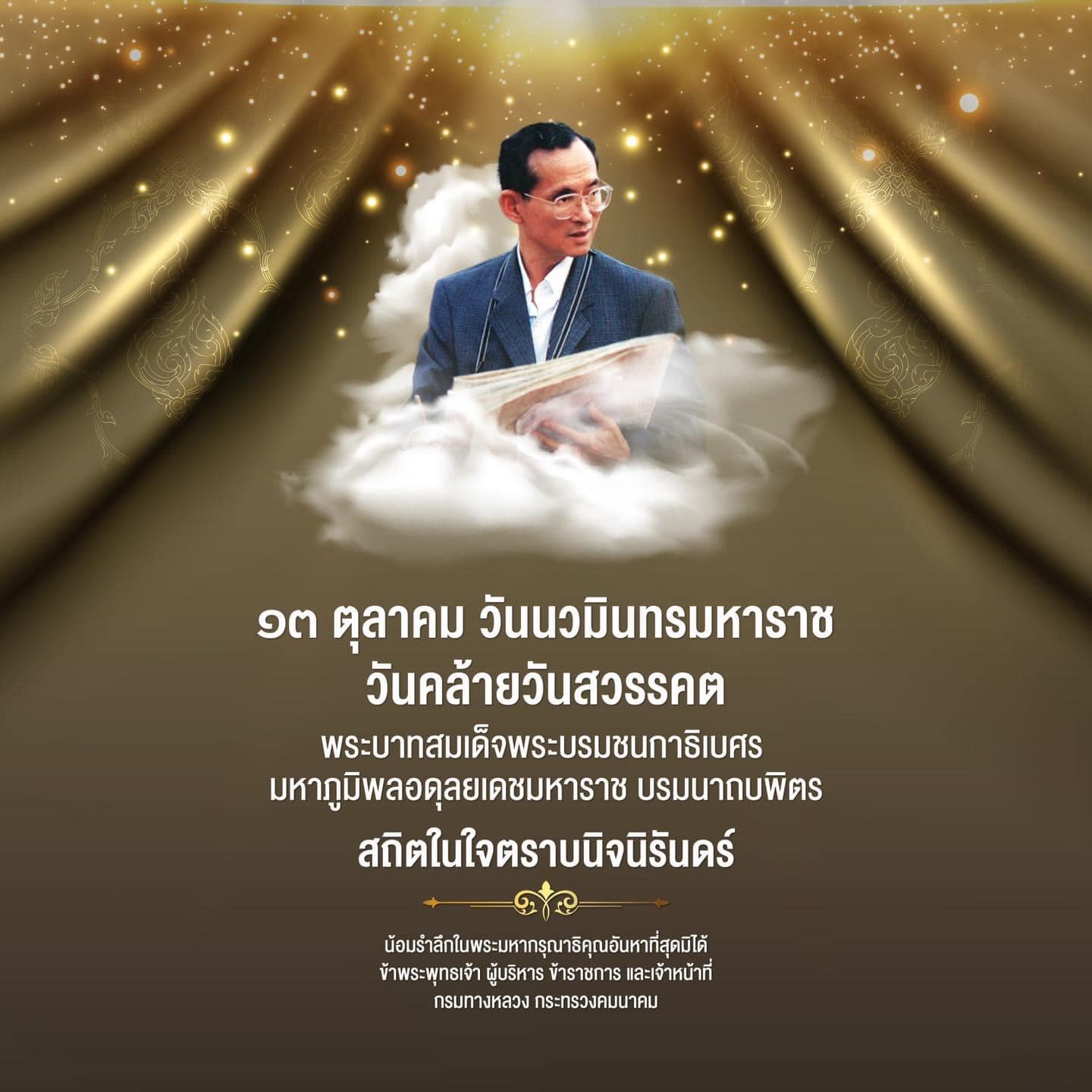 ๑๓ ตุลาคม วันนวมินทรมหาราช น้อมรำลึกในพระมหากรุณาธิคุณอันหาที่สุดมิได้ พระบาทสมเด็จพระบรมชนกาธิเบศร มหาภูมิพลอดุลยเดชมหาราช บรมนาถบพิตร ข้าพระพุทธเจ้า ผู้บริหาร ข้าราชการ และเจ้าหน้าที่กรมทางหลวง กระทรวงคมนาคม