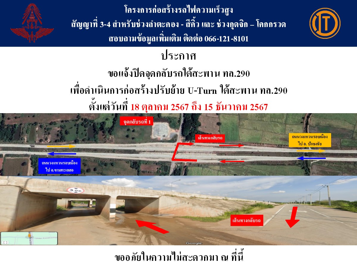 แจ้งปิดจุดกลับ (ชั่วคราว) บริเวณใต้สะพานทางหลวงหมายเลข 290 จ.นครราชสีมา