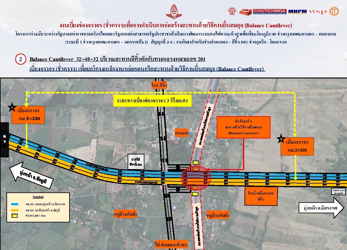 ประชาสัมพันธ์กำหนดการงานเบี่ยงช่องจราจร (ชั่วคราว) เพื่อดำเนินการยกโครงเหล็กงานหล่อคอนกรีตสะพานด้วยวิธีคานยื่นสมดุล