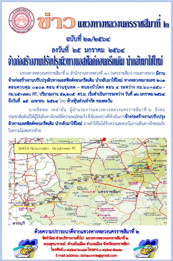 แขวงทางหลวงนครราชสีมาที่ 2 สำนักงานทางหลวงที่ 10 (นครราชสีมา) กรมทางหลวง มีงานจ้างก่อสร้างงานปรับปรุงผิวทางแอสฟัลต์คอนกรีตเดิม นำกลับมาใช้ใหม่ ทางหลวงหมายเลข 201 ตอนควบคุม 0103 ตอน ด่านขุนทด – หนองบัวโคก ตอน 4 ระหว่าง กม.60+850 - กม.65+970 RT. ปริมาณงาน 51,205 ตร.ม. เริ่มดำเนินการระหว่าง วันที่ 16 มกราคม 2564 ถึงวันที่ 15 เมษายน 2564 โดย ห้างหุ้นส่วนจำกัด ทองตะวัน