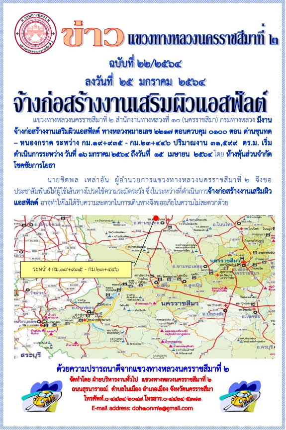 นายชิตพล เหล่าอัน ผู้อำนวยการแขวงทางหลวงนครราชสีมาที่ 2 จึงขอ ประชาสัมพันธ์ให้ผู้ใช้เส้นทางโปรดใช้ความระมัดระวัง ซึ่งในระหว่างที่ดำเนินการจ้างก่อสร้างงานเสริมผิวแอสฟัลต์ อาจทำให้ไม่ได้รับความสะดวกในการเดินทาง จึงขออภัยในความไม่สะดวกด้วย