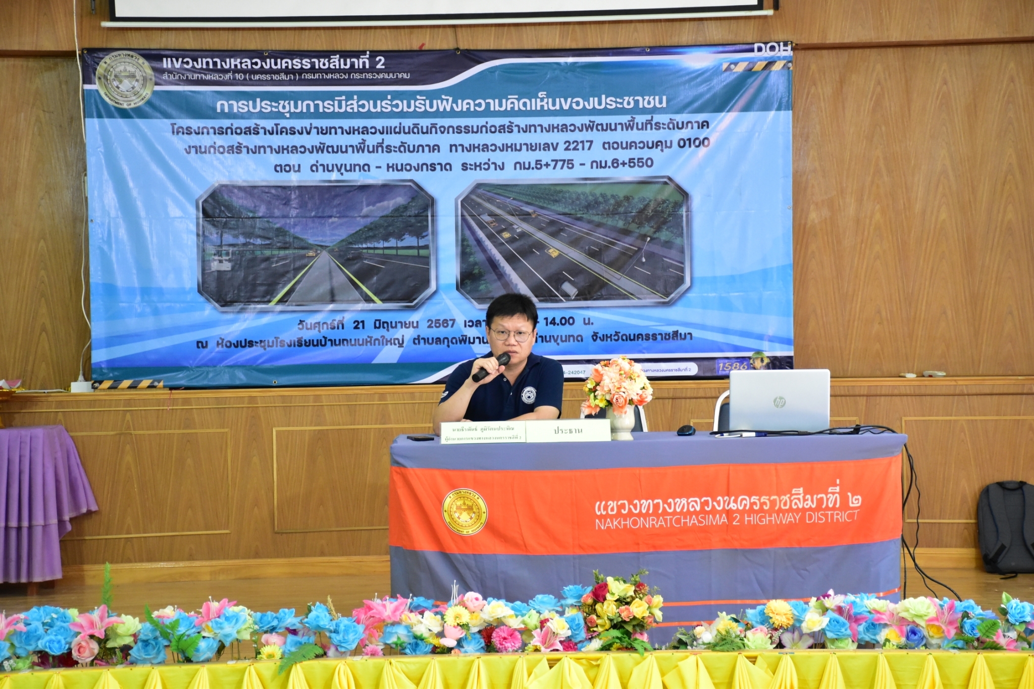 ได้ดำเนินการจัดประชุมการมีส่วนร่วมรับฟังความคิดเห็นของประชาชน โครงการก่อสร้างโครงข่ายทางหลวงแผ่นดินกิจกรรมก่อสร้างทางหลวงพัฒนาพื้นที่ระดับภาค งานก่อสร้างทางหลวงพัฒนาพื้นที่ระดับภาค ทางหลวงหมายเลข 2217 ตอนควบคุม 0100 ตอน ด่านขุนทด – หนองกราด ระหว่าง กม.5+775 - กม.6+550 ณ ห้องประชุมโรงเรียนบ้านถนนหักใหญ่ ตำบลกุดพิมาน อำเภอด่านขุนทด จังหวัดนครราชสีมา โดยมีนายธีรพันธ์ ภูมิรัตนประพิณ ผู้อำนวยการแขวงทางหลวงนครราชสีมาที่ 2 เป็นประธานในการประชุม