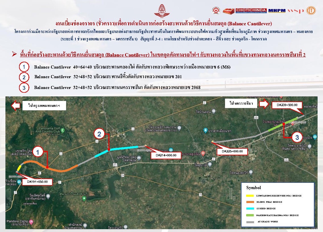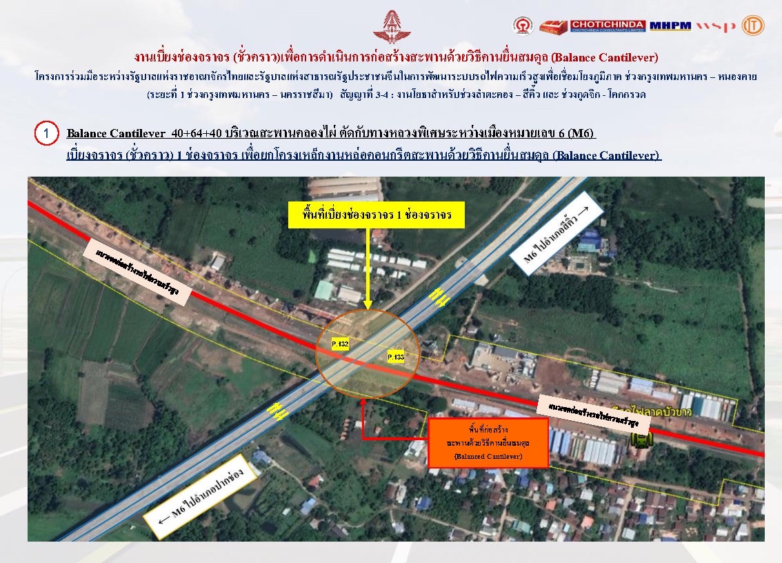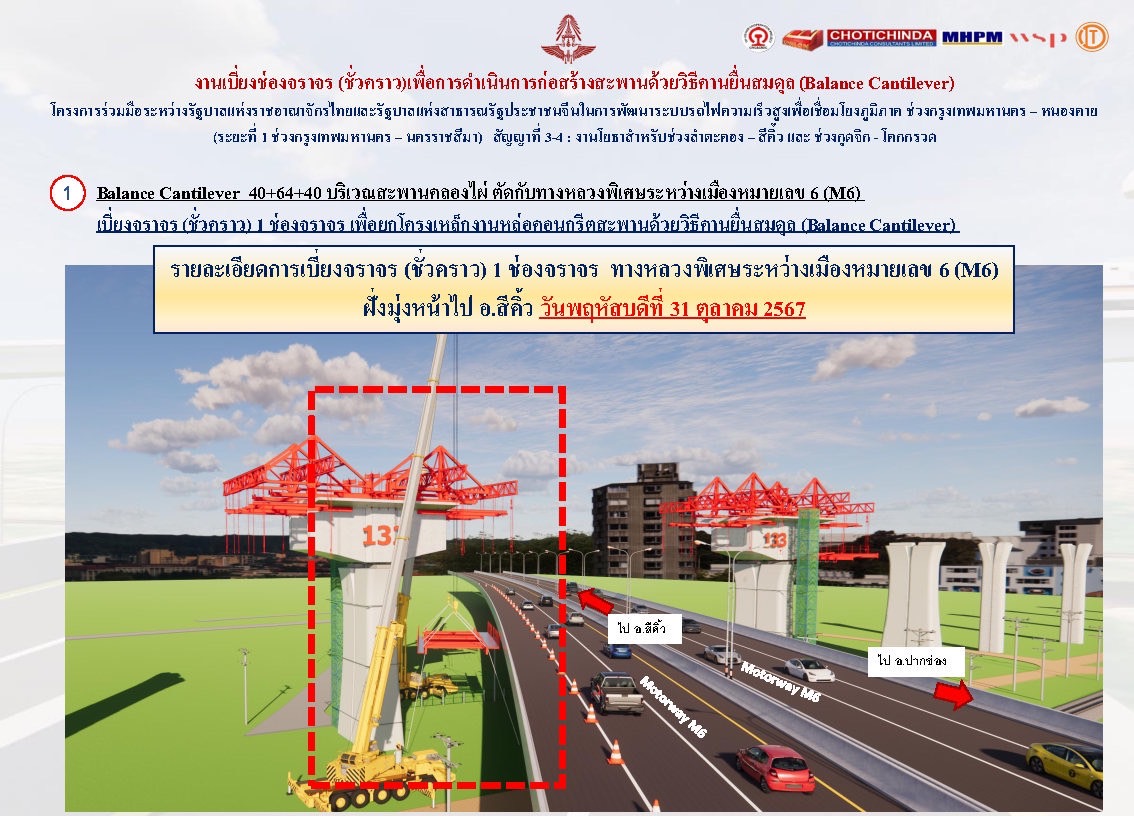 พิกัดจุดที่ 1 วันที่ 31 ตุลาคม 2567 เพื่อยกโครงเหล็กงานหล่อคอนกรีตสะพานด้วยวิธีคานยื่นสมดุล(Balance Cantilever) ตัดกับทางหลวงพิเศษระหว่างเมืองหมายเลข 6 (M6)