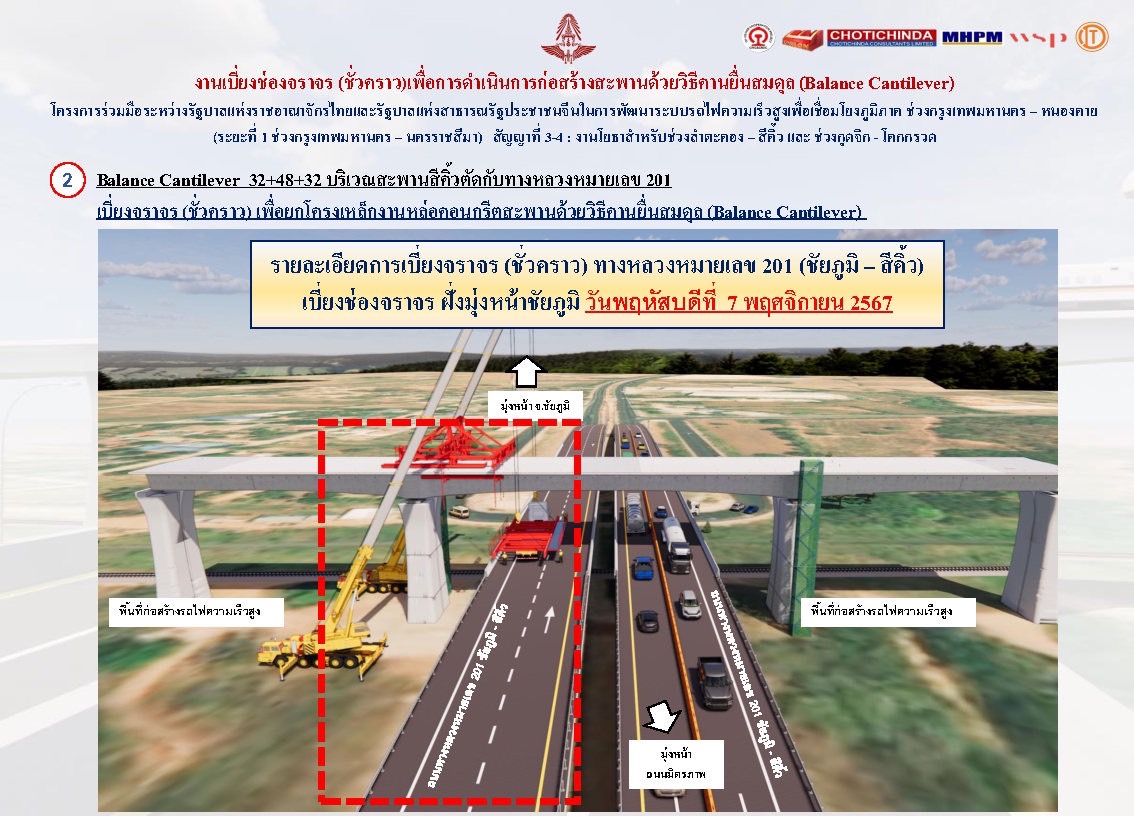 พิกัดจุดที่ 2 วันที่ 7 พฤศจิกายน 2567 เพื่อยกโครงเหล็กงานหล่อคอนกรีตสะพานด้วยวิธีคานยื่นสมดุล(Balance Cantilever) ตัดกับทางหลวงหมายเลข 201
