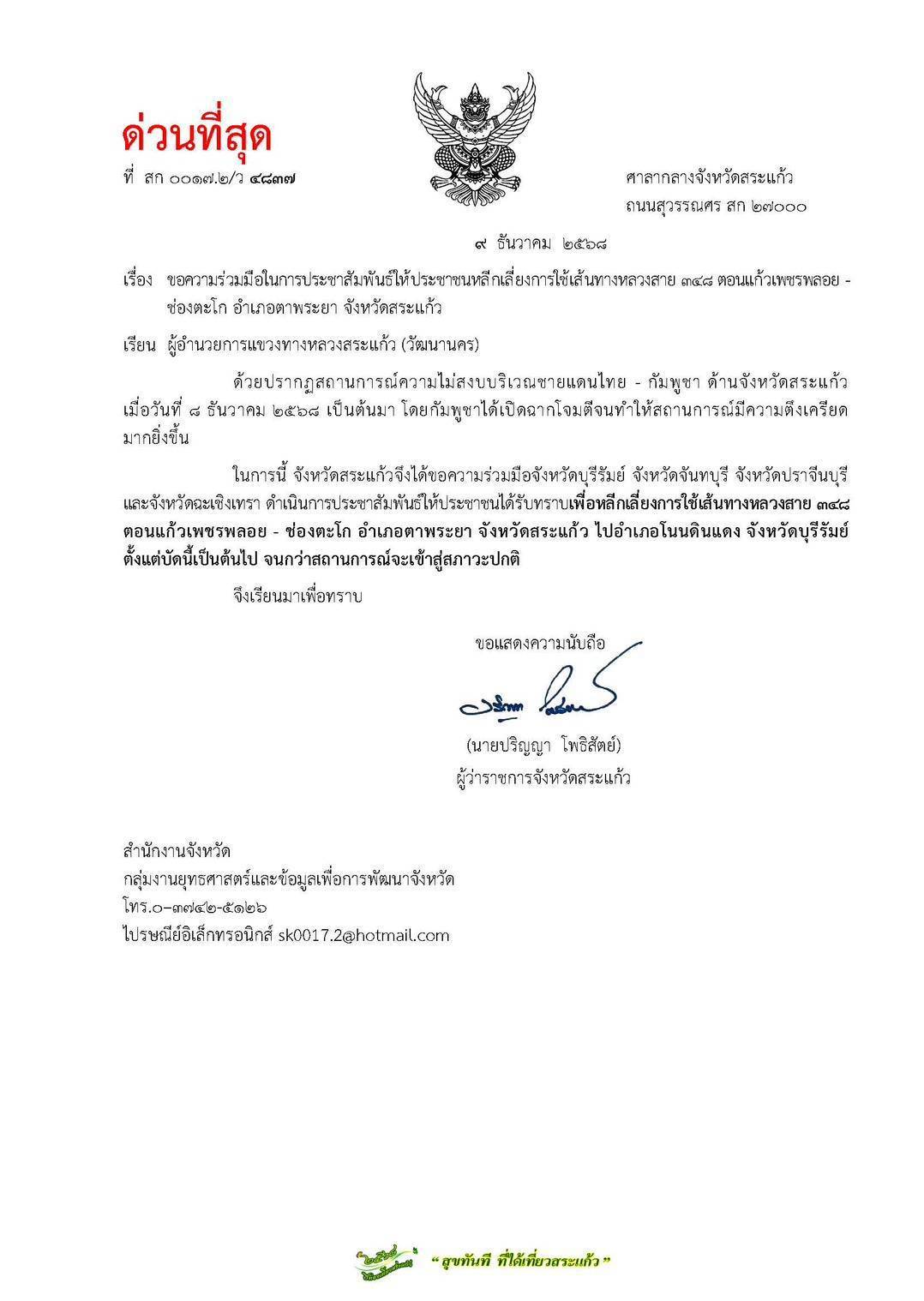 จังหวัดสระแก้วขอความร่วมมือหลีกเลี่ยงการใช้เส้นทางหมายเลข 348 ตอนแก้วเพชรพลอย - ช่องตะโก ที่ไปอำเภอโนนดินแดง จังหวัดบุรีรัมย์ ตั้งแต่บัดนี้เป็นต้นไป